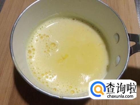 把牛奶蛋液倒入煮锅里,煮到起泡时关火,但不能完全煮开。