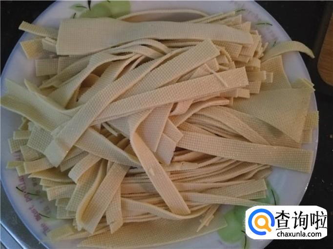 千张冲洗外,切成条状约0.5公分,一根根。
