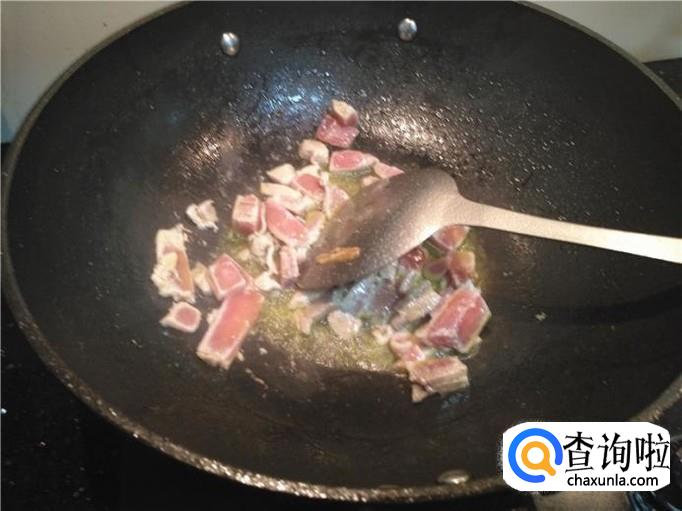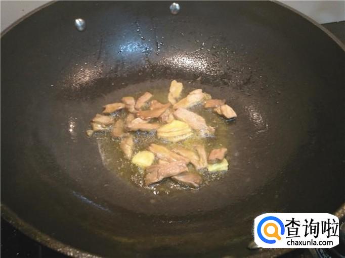 开火,锅里放入油、姜,烧的油有点热了,倒入肉炒一下。