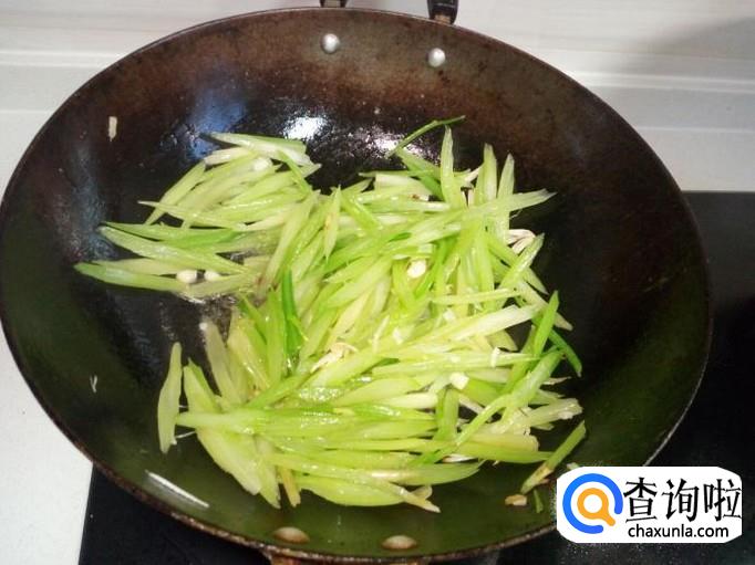 锅内放入油加热,油热后放入花椒,葱,姜,蒜,爆锅,随即放入芹菜,大火爆炒,放入料酒,盐。