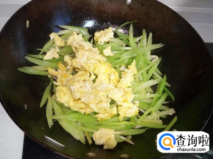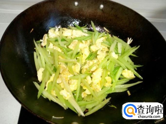 芹菜经开水焯过,略翻炒几下即可,放入炒好的鸡蛋,颠勺翻两下个,放入味精,关火。滴少许芝麻油,出勺。