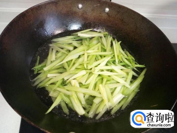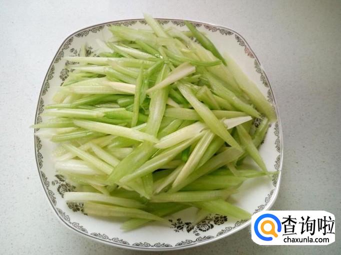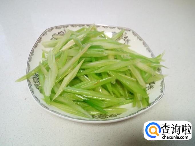 把芹菜放入开水中汆一下,入锅几秒钟即捞出,迅速用冷水过凉,沥干水分,备用。