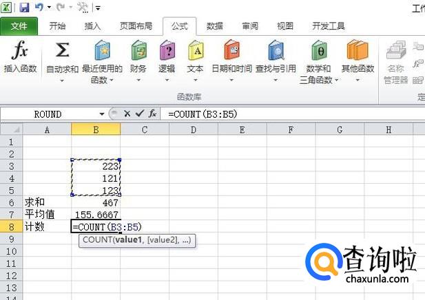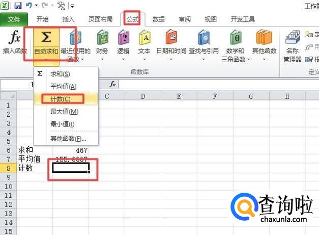 我们选中图示中单元格,然后点击公式,之后点击自动求和的下拉箭头,然后的界面,我们点击计数;