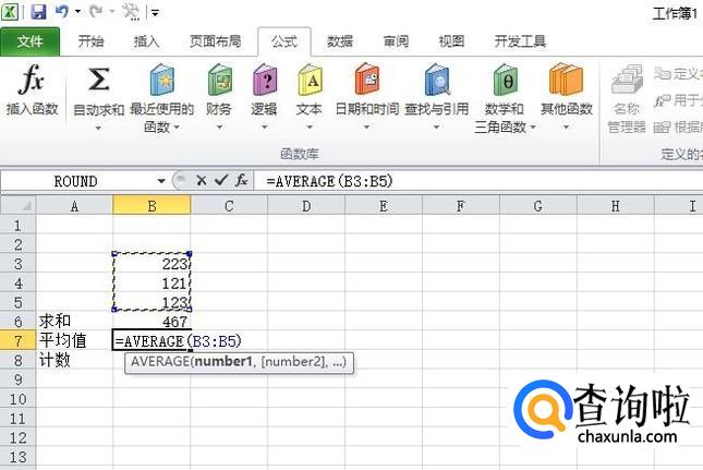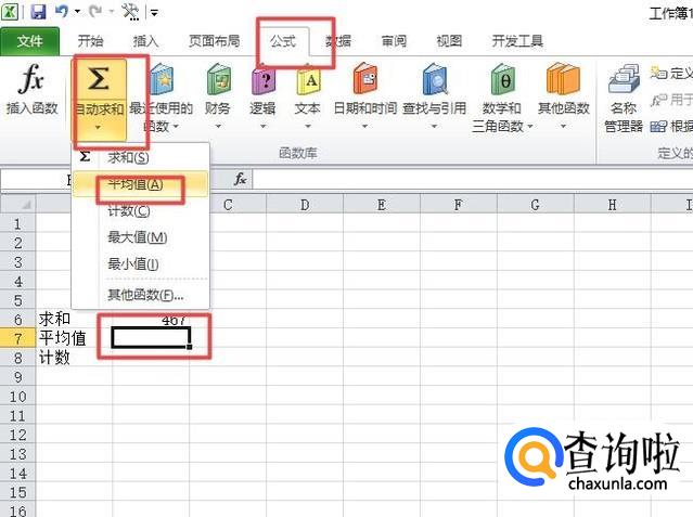 我们选中图示中的单元格,之后点击公式,点击自动求和的下拉箭头,弹出的界面,我们点击平均值;