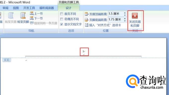 之后我们在页眉中输入1,然后点击关闭页眉和页脚;