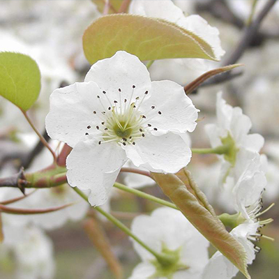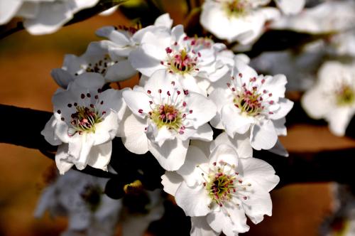 梨花都是纯白色的,花药为紫红色,非常漂亮。不过,也不排除被嫁接过的,这种开出的花朵也有可能是粉红色或者是玫红色。梨花一般是伞房花序,是两性花,花瓣的形状为近圆形,也有的是椭圆形,通常是比叶子先开放。它的花朵不仅很具有观赏性,还会有淡淡的香气。