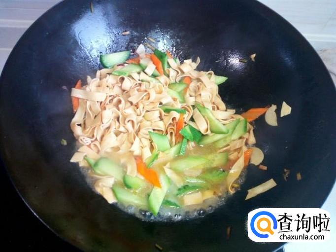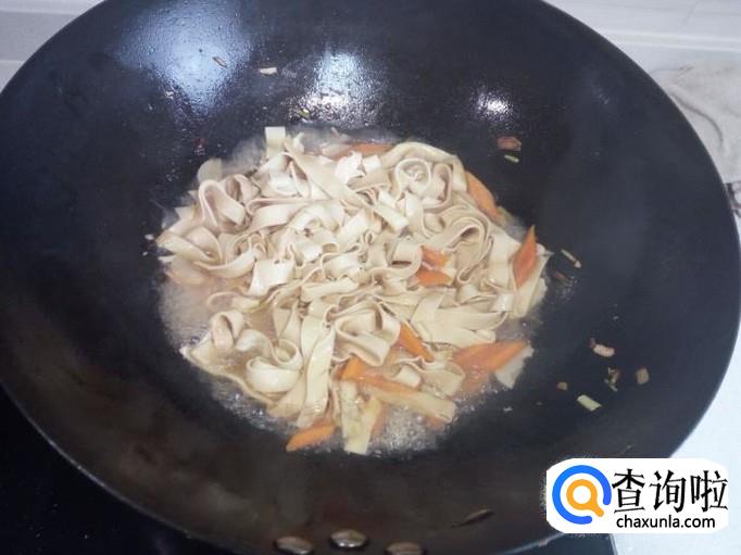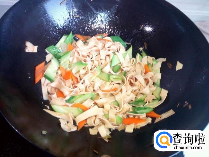 放入干豆腐翻炒,放入少许料酒,少许酱油,盐。放入一勺水,略烧一会。