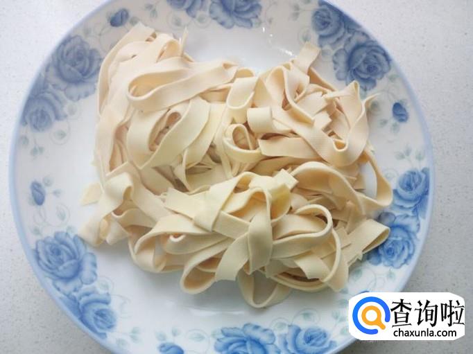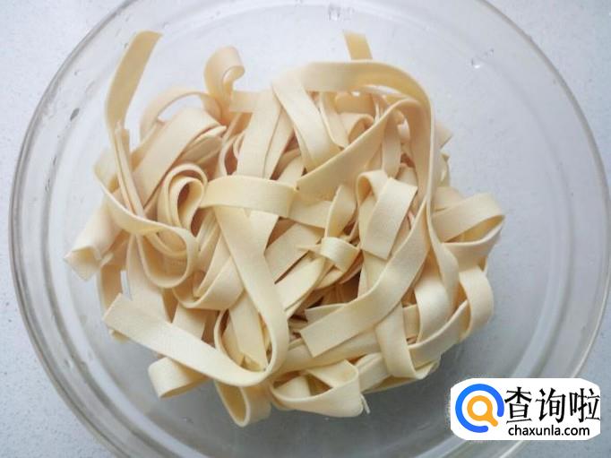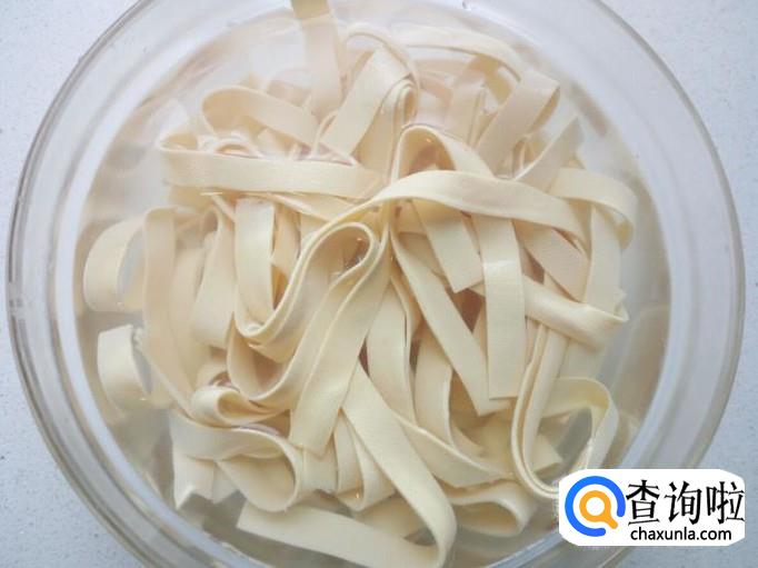 干豆腐用水冲洗一下,切成丝。放入水中浸泡一下,然后用水投几遍,控干水分。
