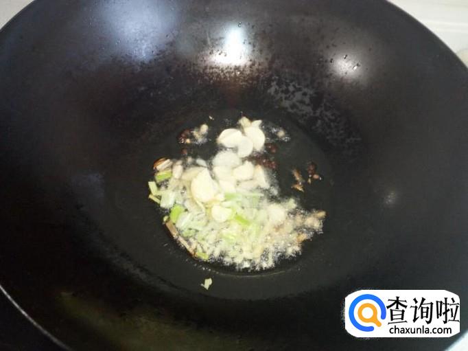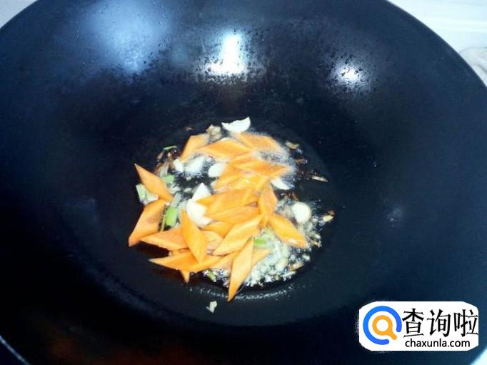 锅内放入油加热,油热后放入花椒,葱,姜,蒜,爆锅。放入胡萝卜片翻炒至变软。
