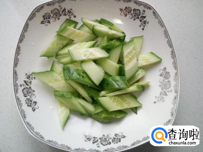 黄瓜用水清洗干净,控干水分,切成片。