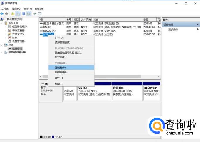 接下来,选择你想要分割分盘的磁盘,单击鼠标右键,选择“压缩卷”,这是为了腾出分盘的空间