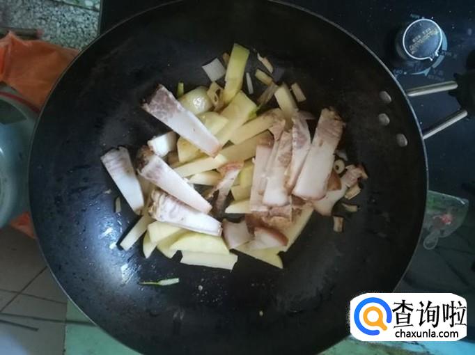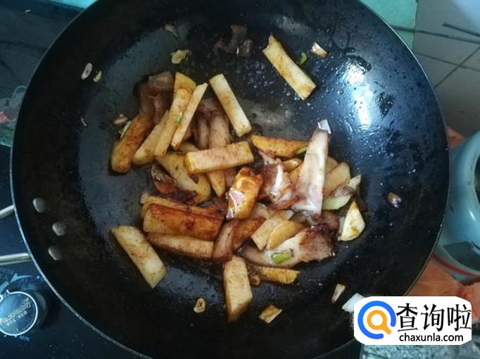 炒锅放火上,倒入适量花生油,等油六成熟时,把葱、姜、蒜入锅煸香,再放入烧猪肉和土豆翻炒。