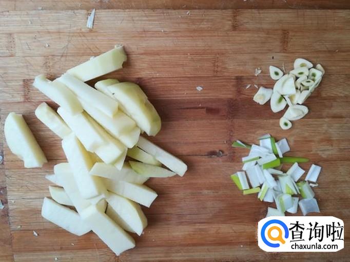 把土豆去皮洗净切成长条,葱切葱花,姜切末,蒜切片。