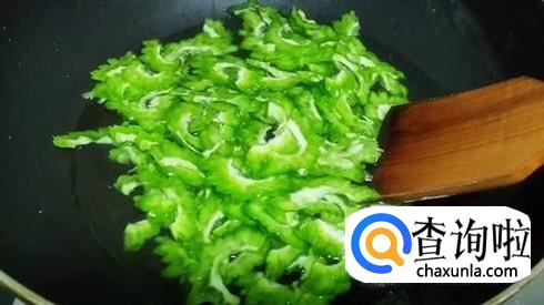 锅中放入适量植物油,油热后到入葱丝姜丝,炒出香味后倒入焯过水的苦瓜片,翻炒一下。