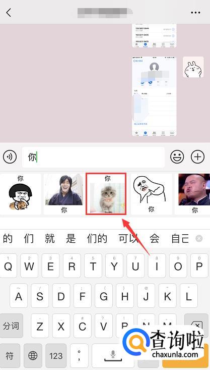 这里我们输入一个“你”字,输入之后键盘上会出现很多关于“你”的表情包,选择一个你喜欢的,点击一下。
