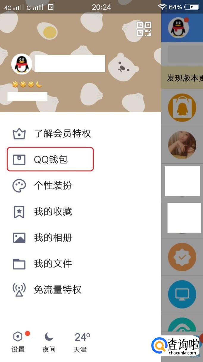 在弹出菜单中,可以看到QQ钱包选项,点击一下进入。