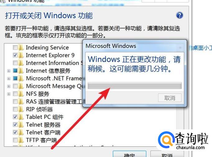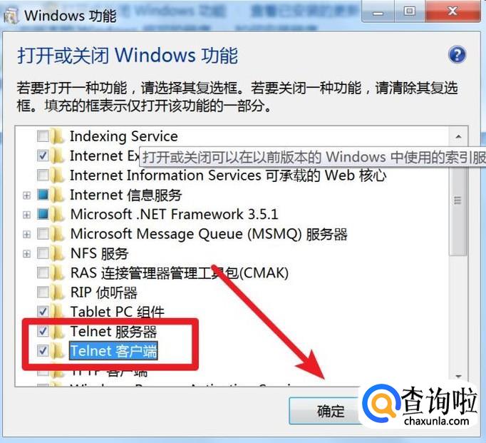 在这个Windows功能窗口里,我们点击勾选上Telnet的这二个功能,点击确定按钮。
