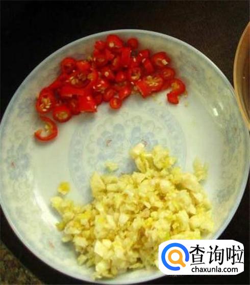 姜蒜剁碎,喜欢吃辣的,可以准备几颗红辣椒,切碎。备用。