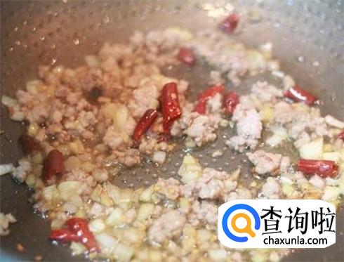 热锅下油,放入姜蒜辣椒煸香,然后倒入肉沫翻炒,再加入少许的豆瓣酱、麻油、香油,一起搅拌均匀。