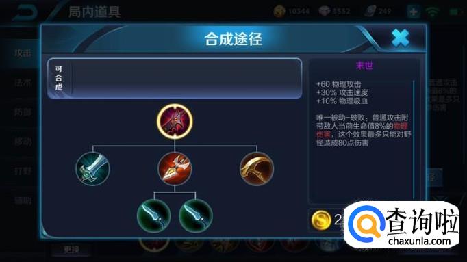 首先介绍一下装备,末世,中前期装备,增加60物理攻击,30%攻击速度,10%物理吸血,唯一被动会对普通攻击附带目标当前生命值的8%的物理伤害,金币2160,价格较便宜,可以选择成为射手第一件攻击装备。