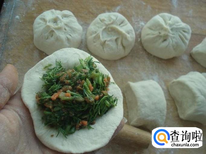 把面剂子逐个擀好皮,取一个包子皮放入调好的馅,按喜欢的花纹包好,放入蒸锅,直到把所有的皮都包完为止。