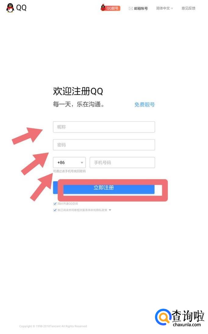 进入到qq邮箱注册界面,填写完成“昵称”、“密码”、“手机号码”,最后,点击“立即注册”立刻。