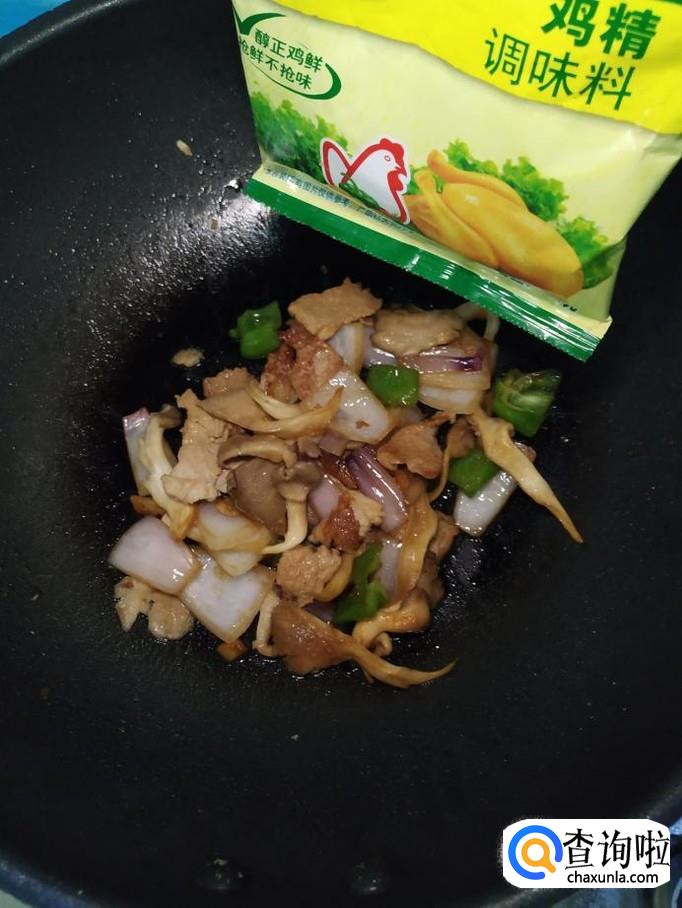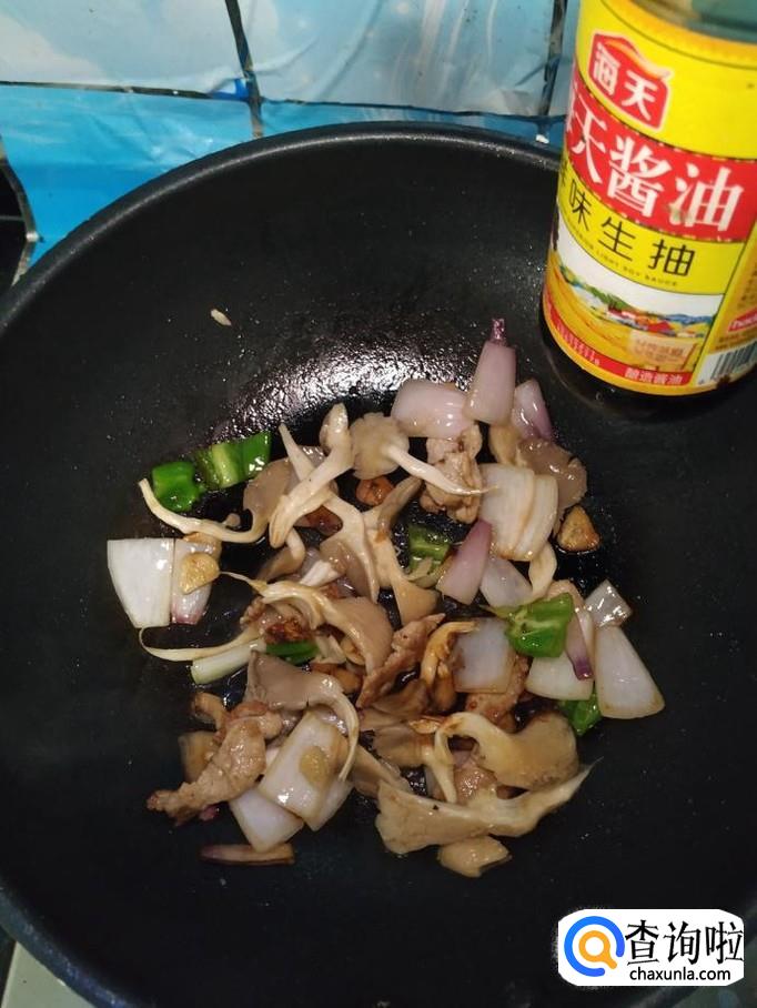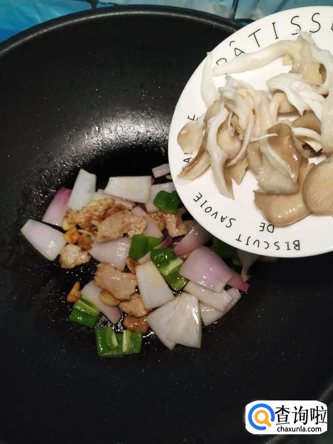 将准备好的平菇也倒入锅中,和洋葱,青椒一起翻炒。