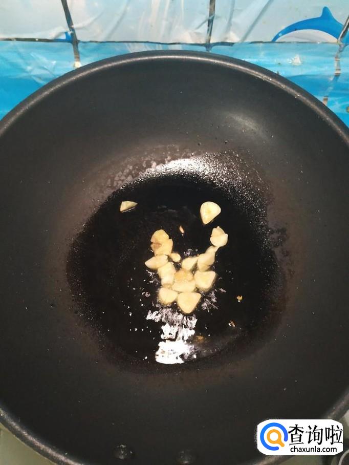 准备适量蒜,剥去外皮,切成片,炒锅中放入适量油,油热后将蒜片放入锅中炒香,然后将猪里脊肉倒入锅中,翻炒均匀。