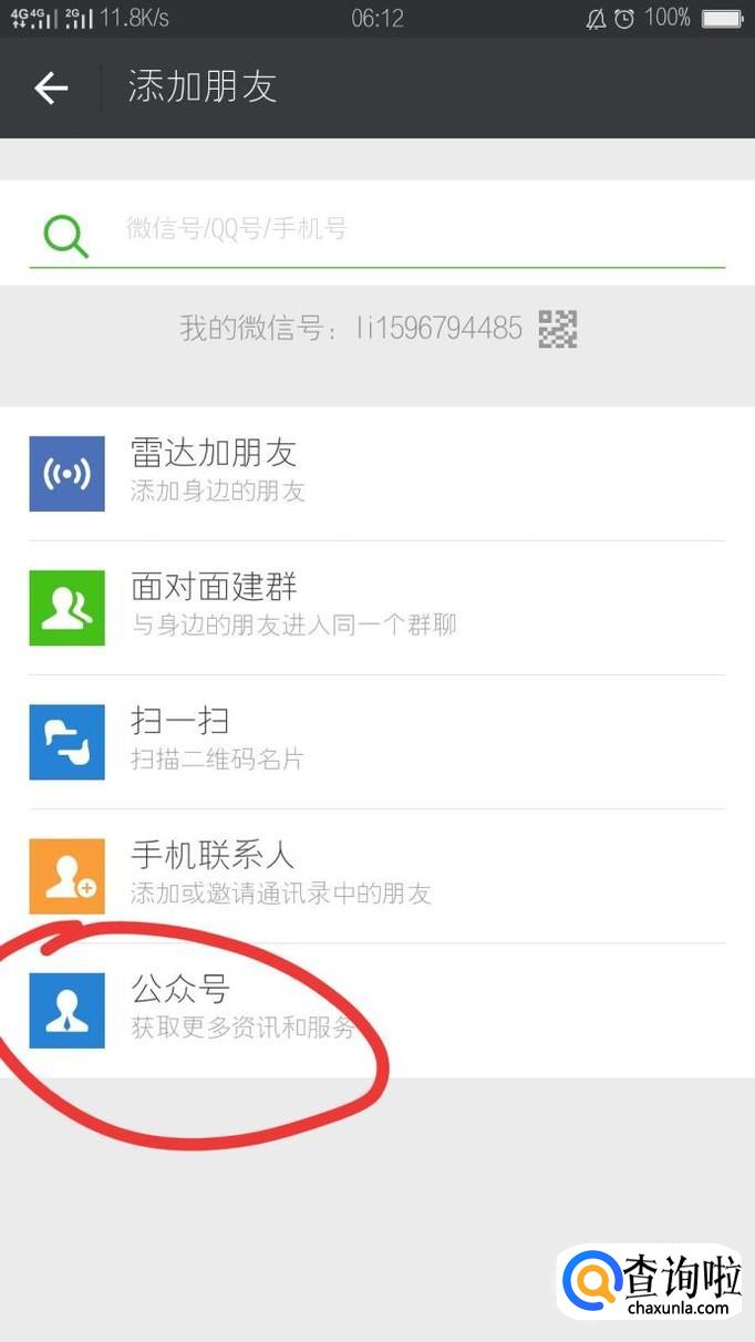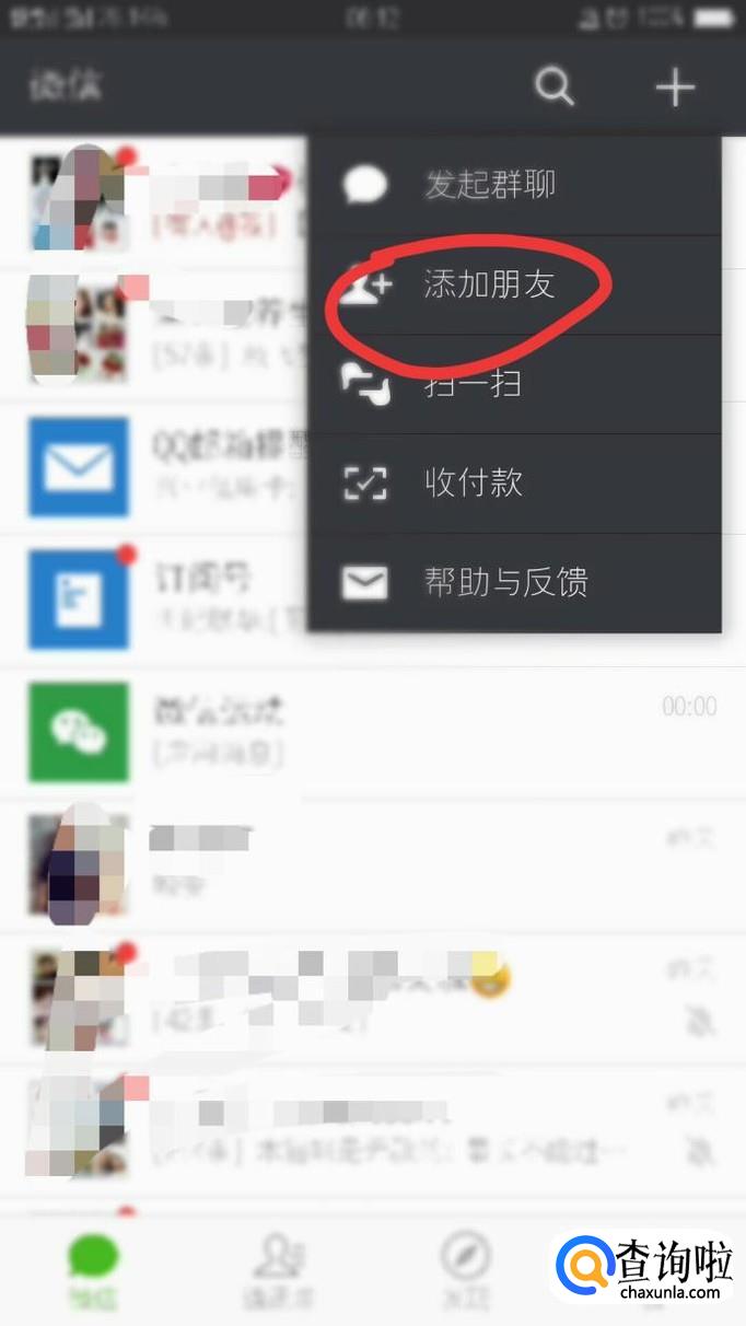 登陆微信,点击右上角的+中的添加好友。