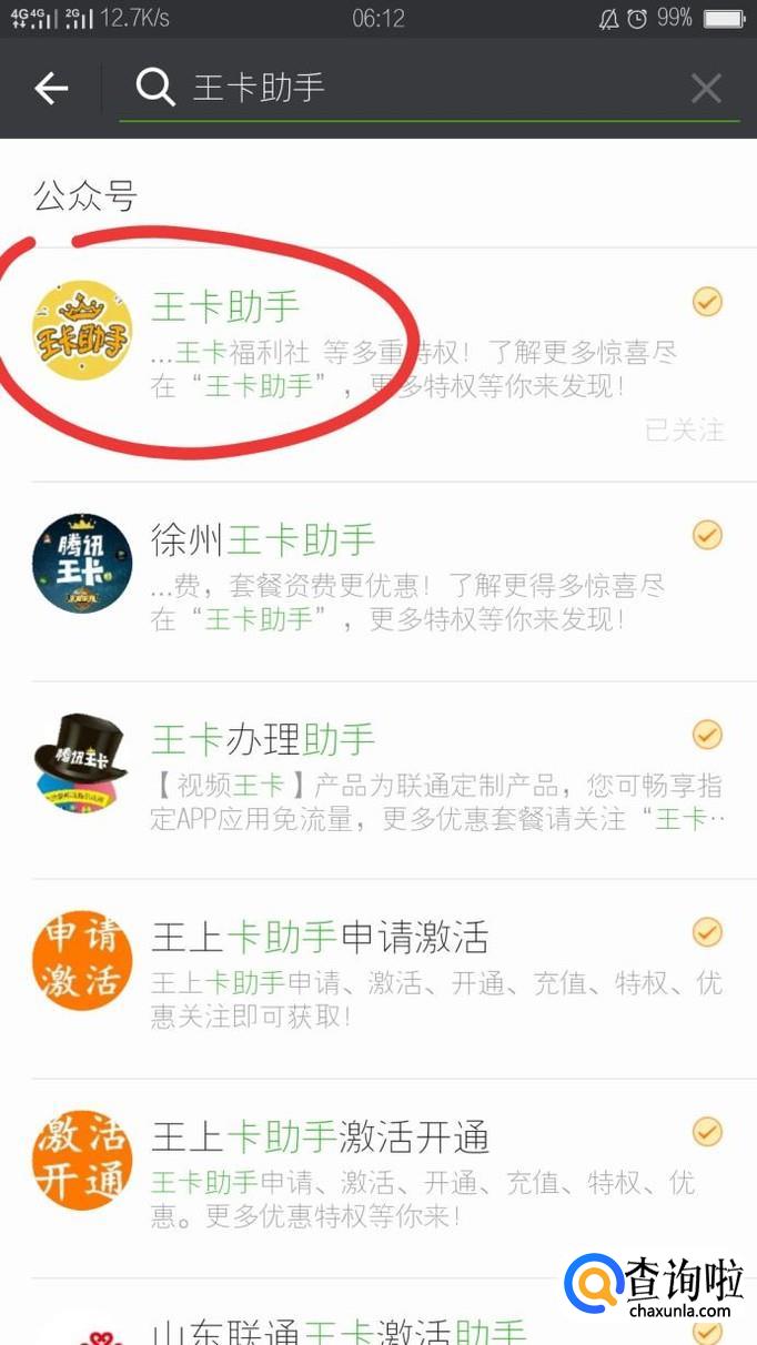 点击公众号,输入王卡助手开始进行搜索。