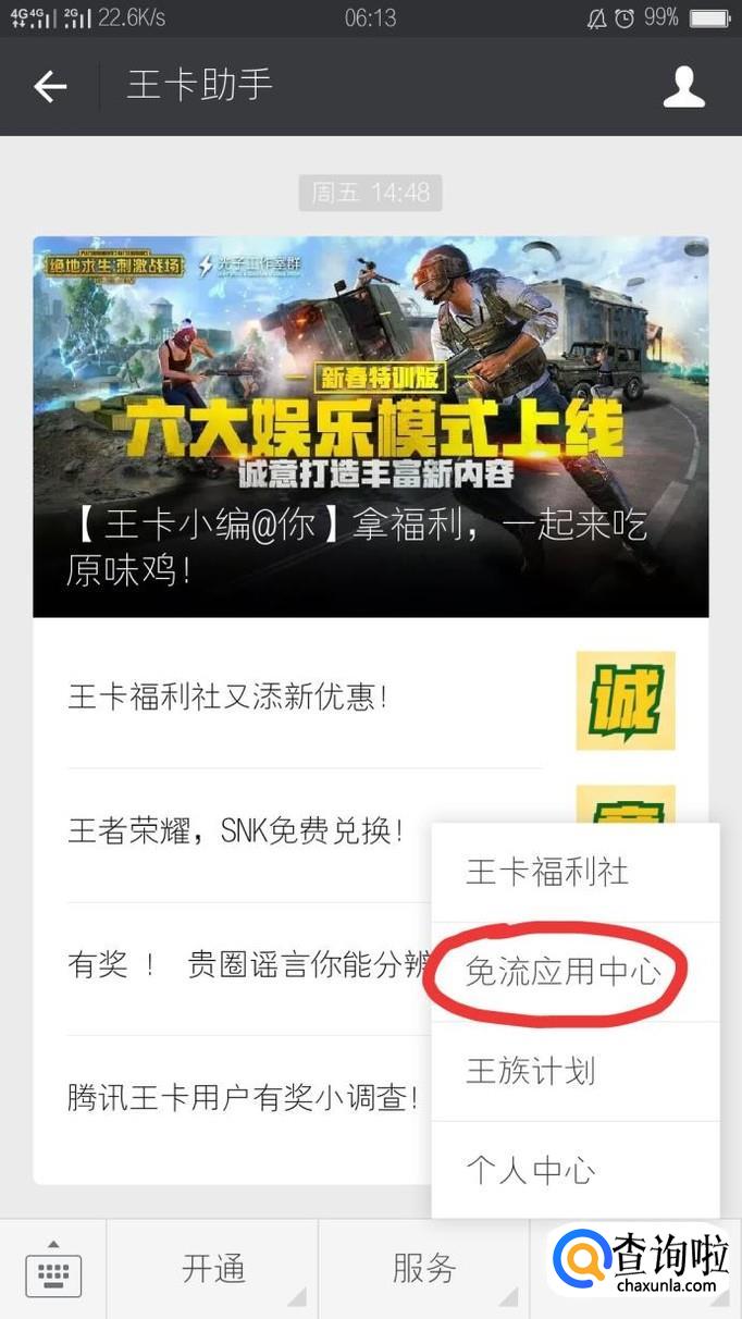 打开王卡助手特权下面子栏目中的免流应用中心。