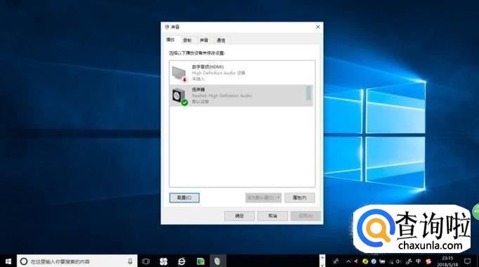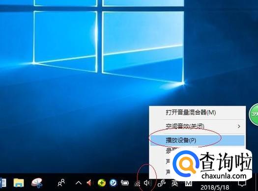 启动Windows 10操作系统,如图所示。右击任务栏通知区域"音量"图标,选择"播放设备"项。