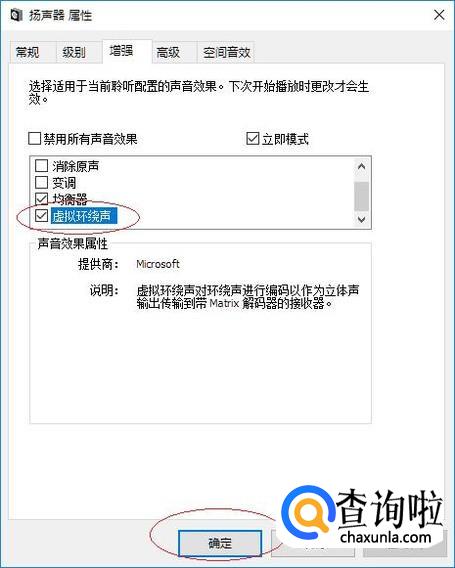 勾选"虚拟环绕声"复选框,完成点击"确定"按钮。如图所示,本例到此希望对大家能有所帮助。