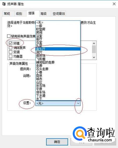 如图所示,选项框勾选"环境"复选框。点击"设置"向下箭头,弹出下拉列表选择"音乐厅"项。