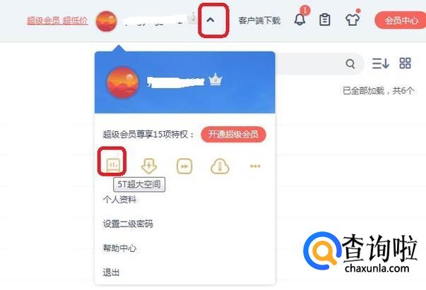 在“百度网盘”的登录界面右上角,如图所示,点击用户名旁边的下拉菜单,并点击“5T”超大空间。