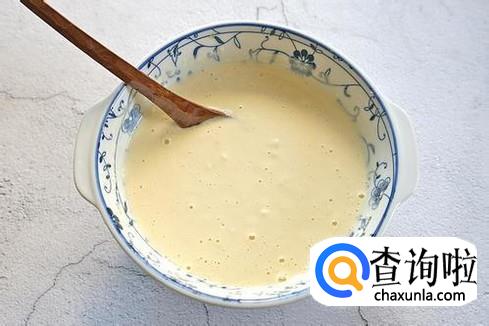 把鸡蛋磕碗里,加入适量面粉,盐,用筷子搅匀,调成糊状,再把切好的茄子片放碗里,裹上一层面糊。