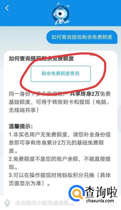 进入“在线服务”页面后,在下方的对话框中输入“如何查询提现剩余免费额度”,然后发送,机器人客服就会马上自动回复。点击机器人客服回复的“剩余免费额度查询”。