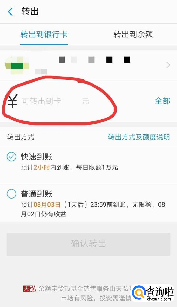 在“转出”页面的输入转出的金额那里就可以看到免费转出到银行卡的额度。