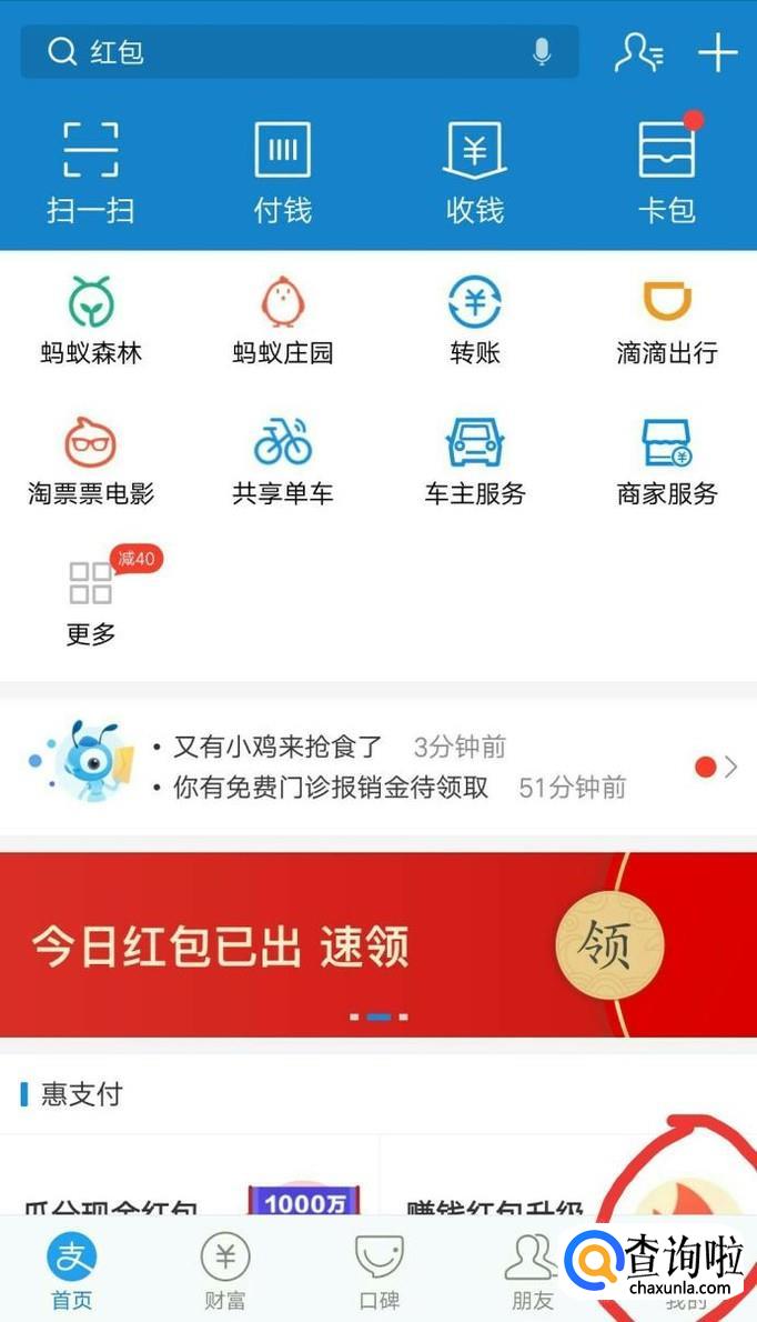 登录支付宝账号进入支付宝首页,点击右下角“我的”。