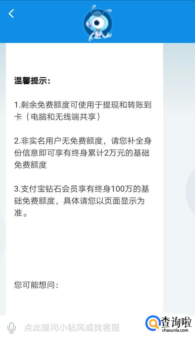 第二种情况:提现或者转出到银行卡应用,每个实名用户有累计两万的免费额度,超出后将按照0.1%收取服务费。剩余额度查询方法如下: