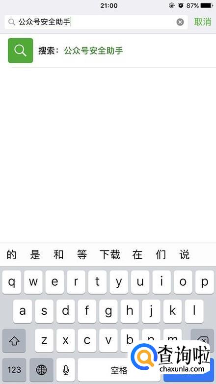 打开手机微信,然后点击添加微信公众号,然后输入“公众号安全助手”,这时候就能搜索到这个微信公众号了。