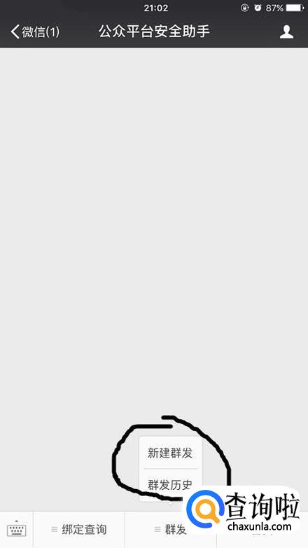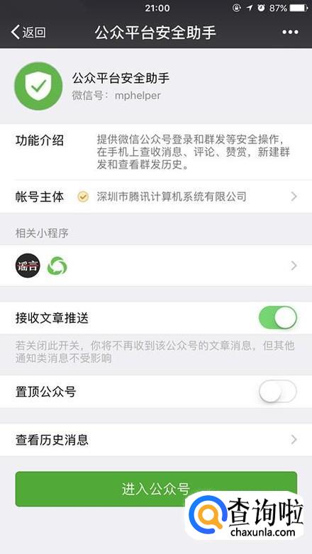 点击进入公众号安全助手。如果自己有用手机发过群发消息的话,这时候就可以直接点击进入公众号了,直接进入即可。