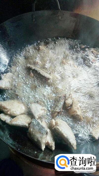 往锅中倒入适量植物油,油熟以后放入带鱼炸致通体焦黄后捞起。注意控制油温,油温过高碳化就不好吃了。