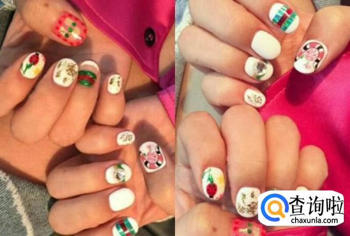 第二款,是名族风与潮流元素相结合的一款美甲,白色打底。然后在上面画上各种各样的图案,可爱的小鸟,花朵等等,可以使指甲显得丰富多彩