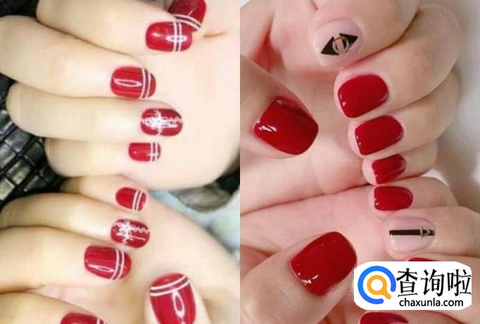 第三款,适合手偏白的伙伴。两款都用樱桃红做打底,再加上简单的线条装饰。樱桃红纯色的指甲看起来本来也就十分不错,加上简单的点缀,可以显得更加的时尚