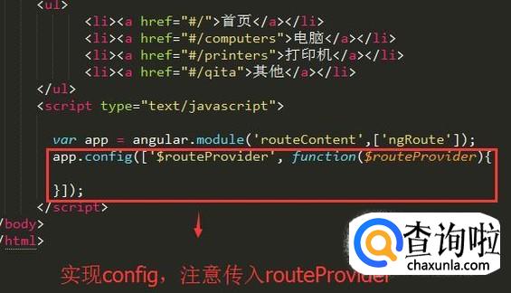 然后通过angular实例来实现config方法,如下图所示,在config方法中传入参数routeProvider