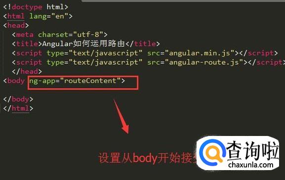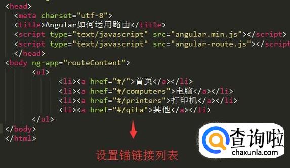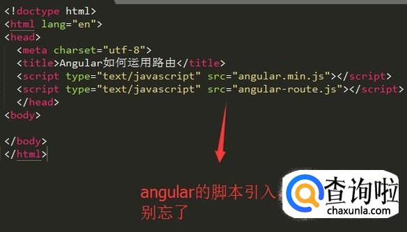 首先在Sublime Text新建HTML页面,然后导入angular.min.js和angular-route.js两个脚本文件,如下图所示