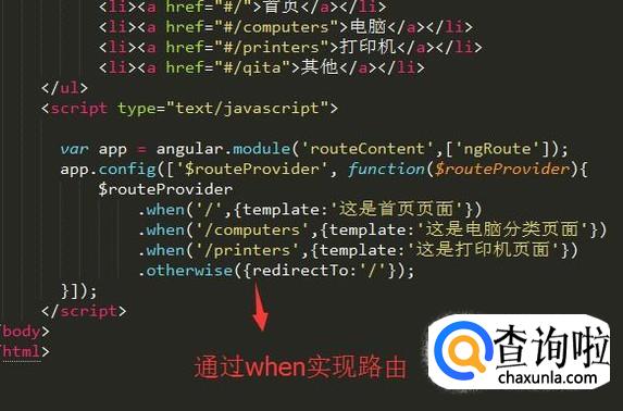 接下来利用routeProvider中的when方法来匹配路径,然后实现路由跳转,如下图所示