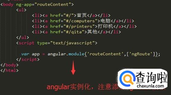 接下来我们就需要在script标签中通过module方法实例化angular了,注意实例化的时候添加ngRoute依赖,如下图所示