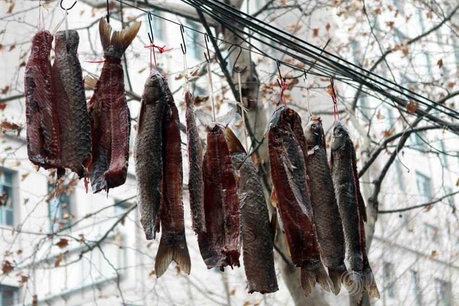 4、将抹好盐的鱼肉放入缸内腌制一周左右,腌的过程浸出的血水不用倒掉,腌三天后将鱼肉翻一下再腌。鱼肉腌好后用绳子挂起来放在通风的地方或太阳下晾晒。